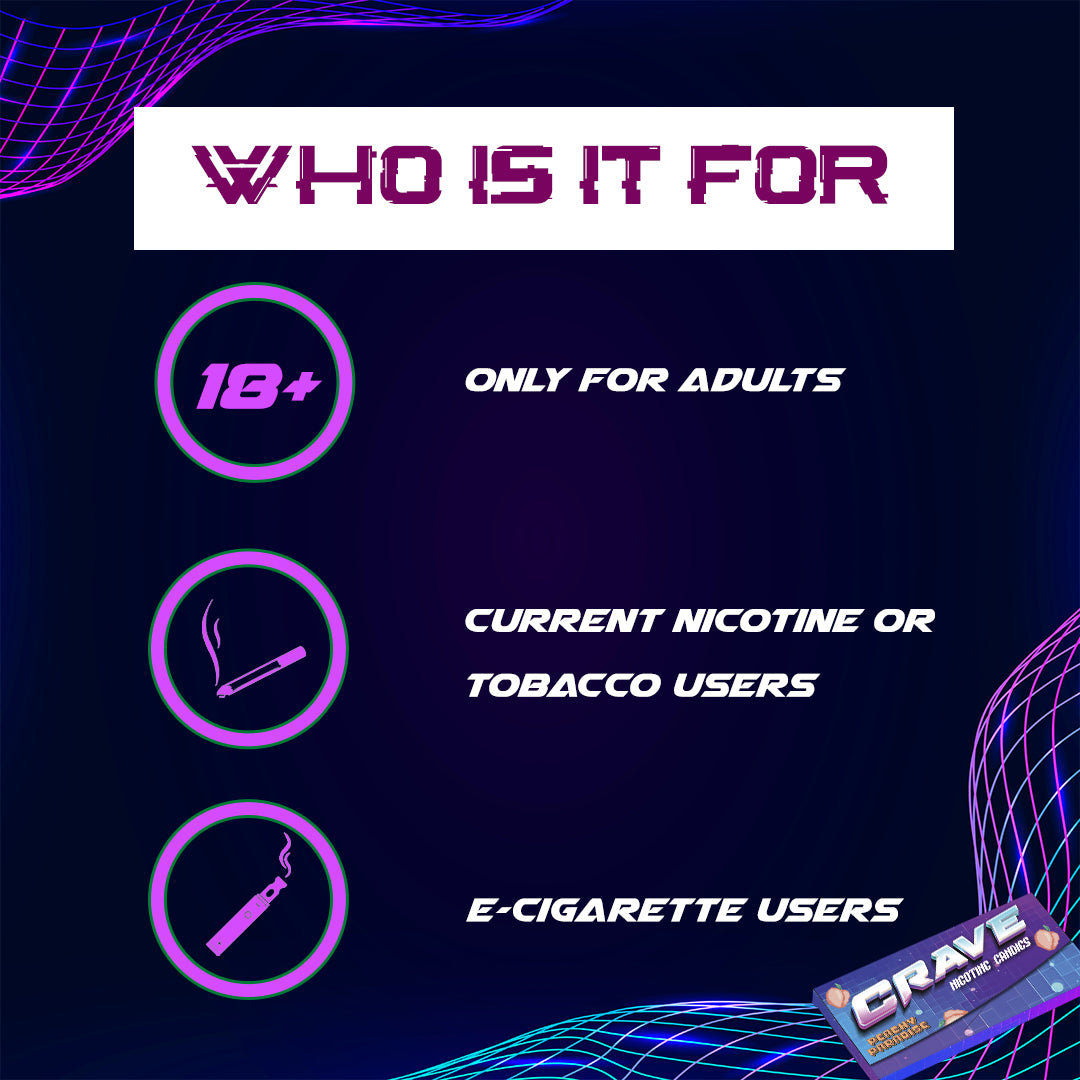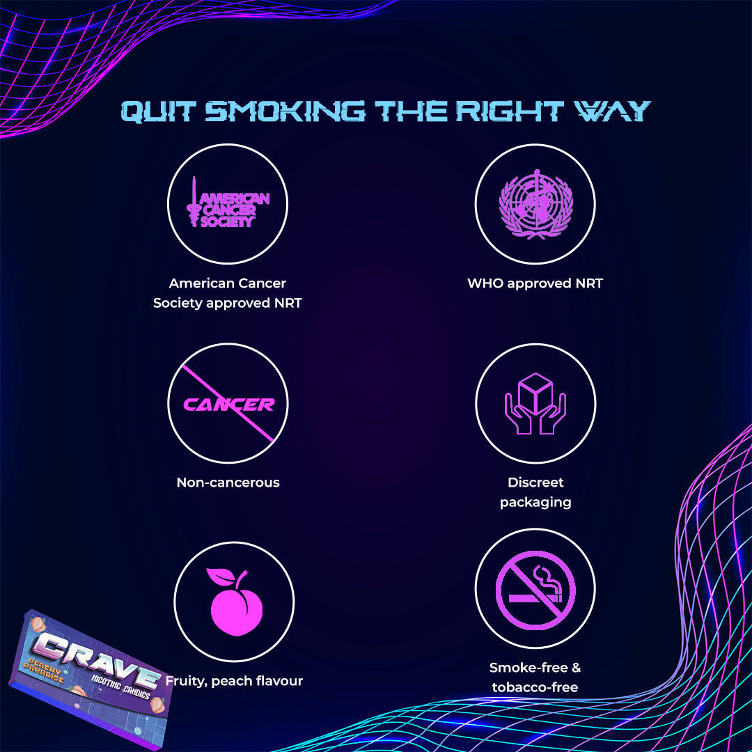 Crave’s Peachy Paradise candy just has all the good stuff and no nasties. It’s smoke-free, tobacco-free, and tastes good too. Bear in mind, it comes with the risks of Nicotine (an addictive substance).