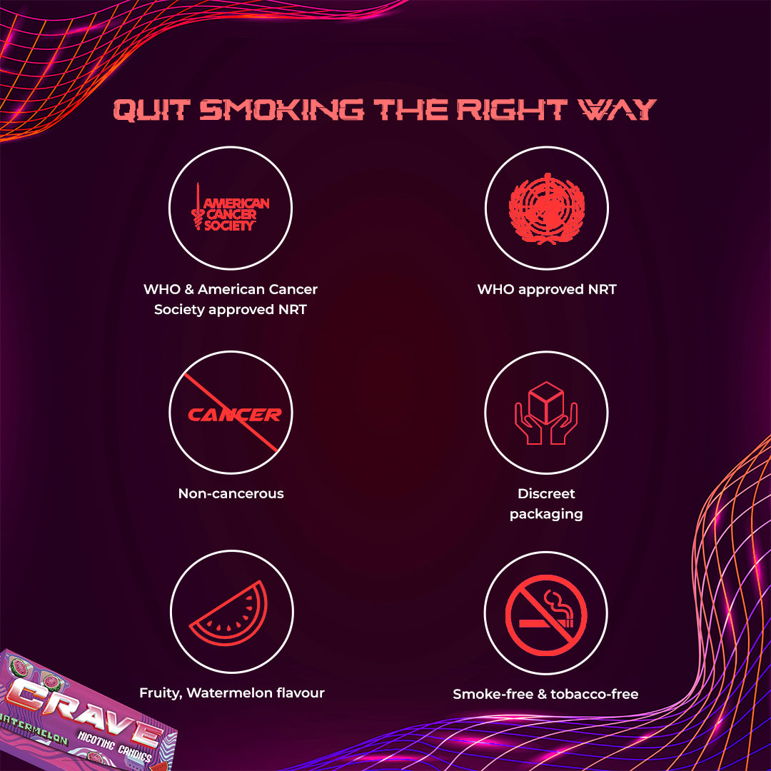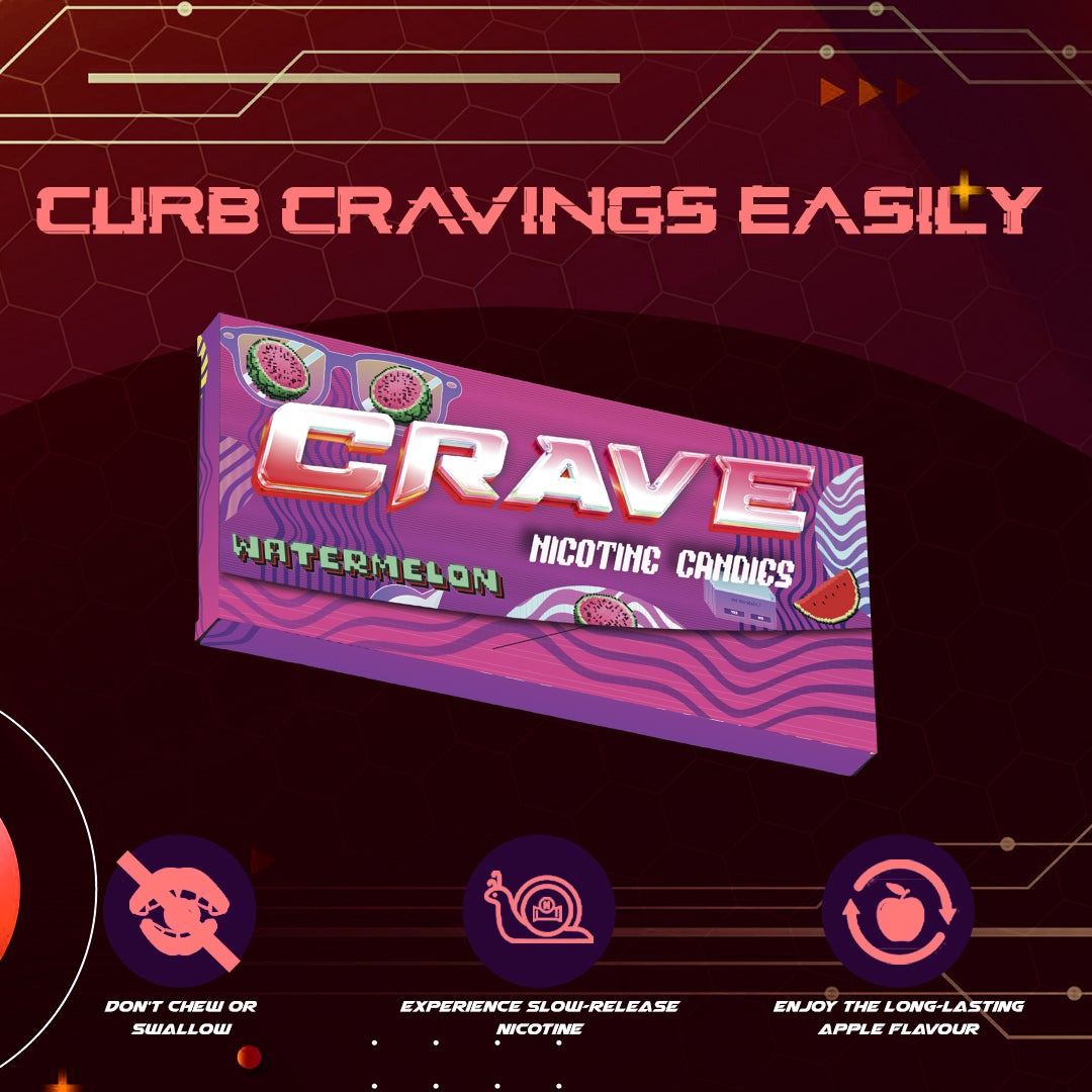 Crave’s Watermelon candy just has all the good stuff and no nasties. It’s smoke-free, tobacco-free, and tastes good too. Bear in mind, it comes with the risks of Nicotine (an addictive substance).